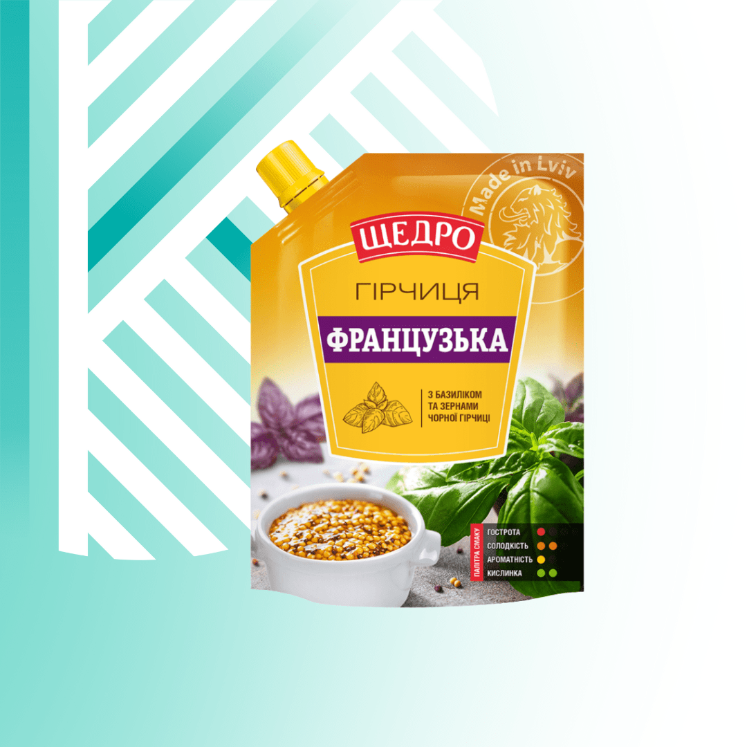 Склад: вода питна, зерна гірчиці білої 23%, цукор білий, зерна гірчиці чорної 3%, регулятор кислотності: кислота оцтова харчова, сіль кухонна, олія соняшникова рафінована дезодорована, куркума, кмин, екстракт базиліку 0.01%, базилік 0.01%
