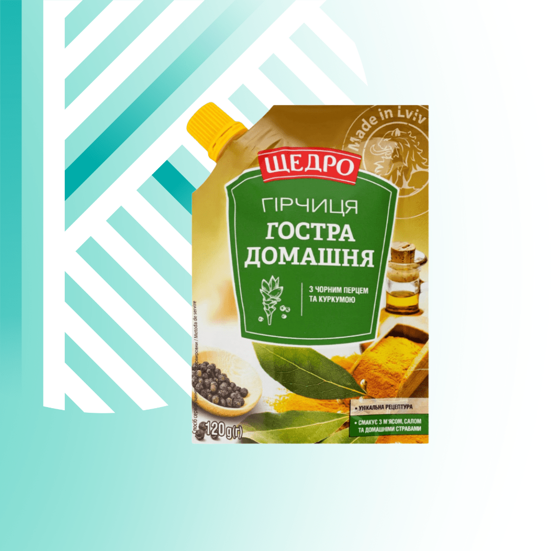 Склад: вода питна, порошок гірчичний, цукор білий, олія соняшникова рафінована дезодорована, сіль кухонна, регулятор кислотності: кислота оцтова харчова, куркума, стабілізатор:камедь ксантанова, перець чорний, лавровий лист.