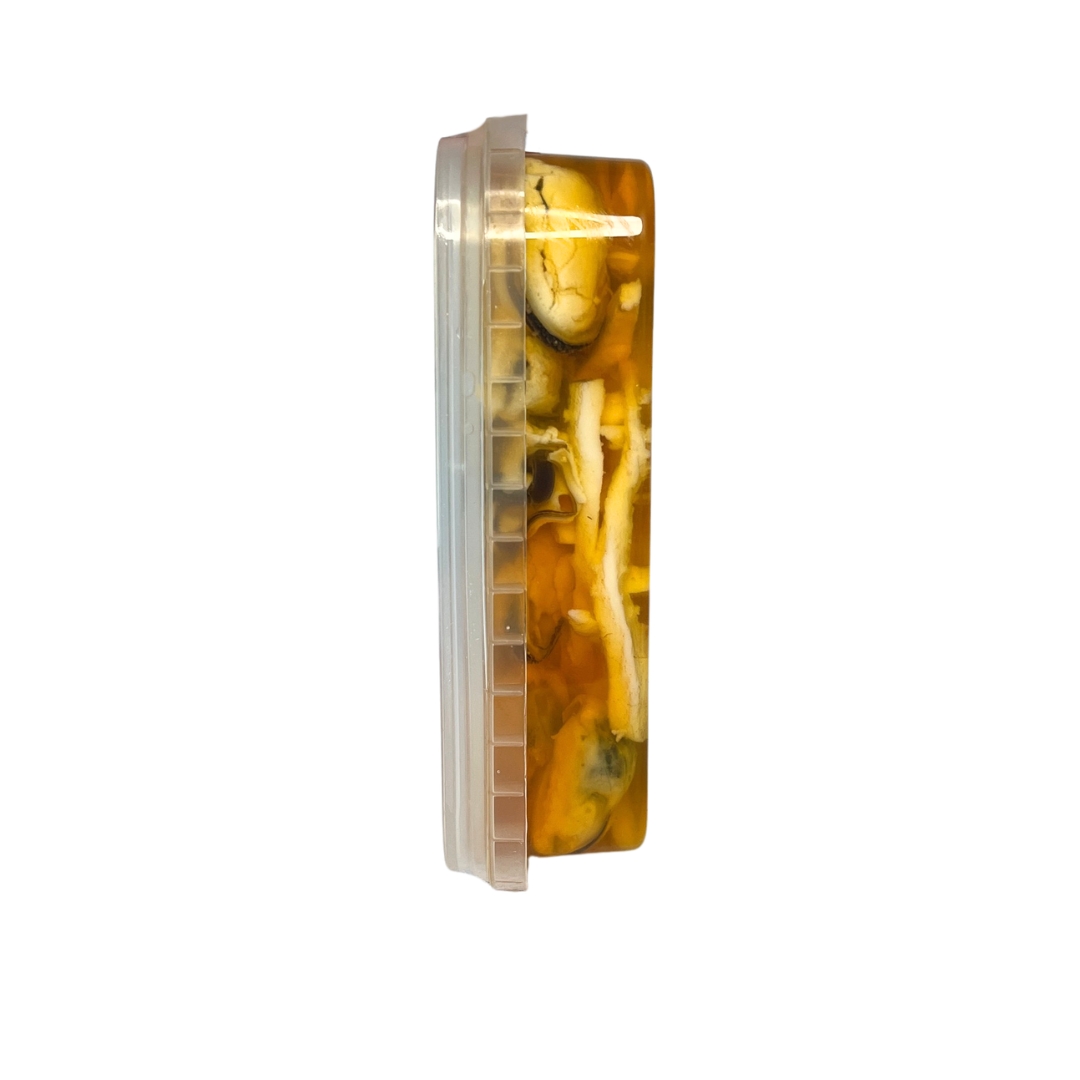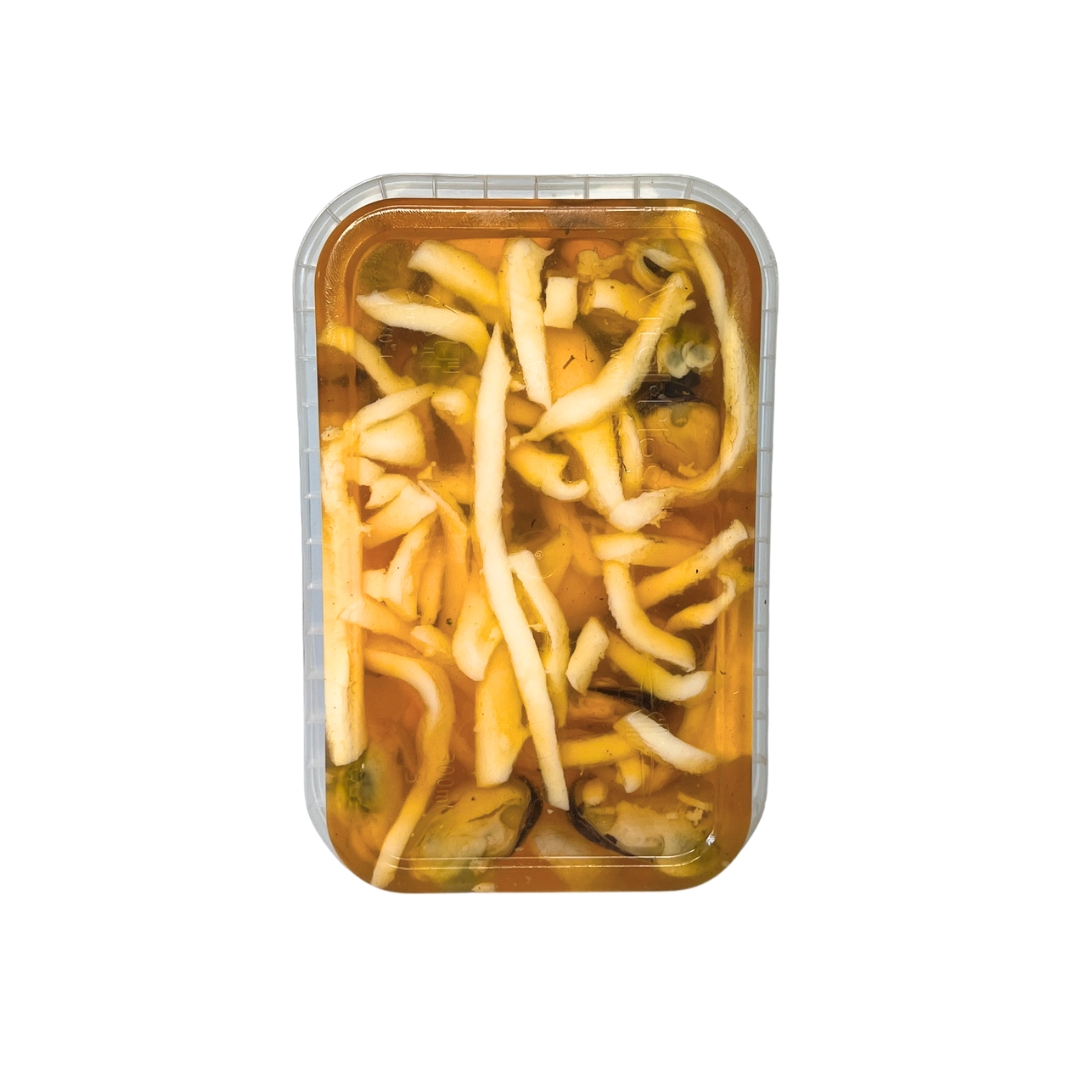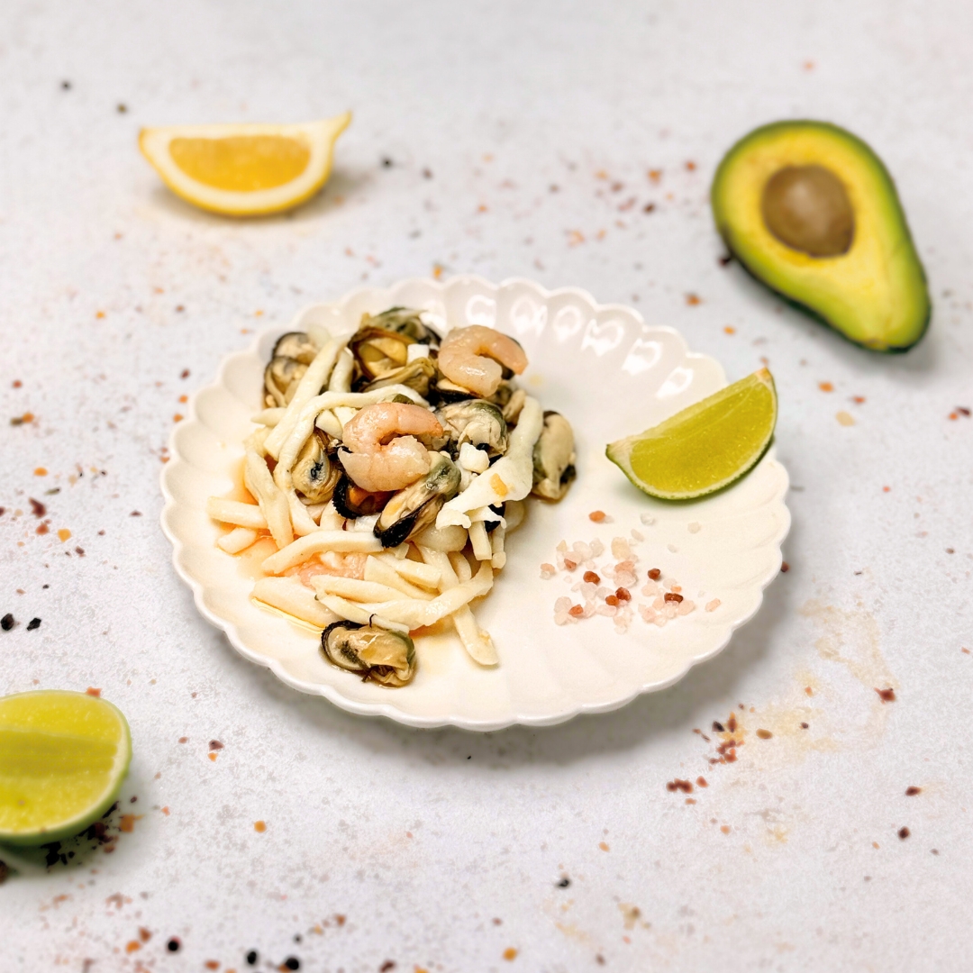 Склад: креветки варено-морожені, мідії варено-морожені, кальмар варений, олія соняшникова рафінована, оливки мариновані, сіль кухонна, аромат краба.