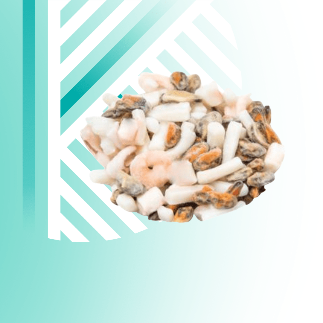 Склад :Варене м’ясо мідій , щупальця кальмара різані , креветка чищена, смужки кальмара, восьминіг обрізи.