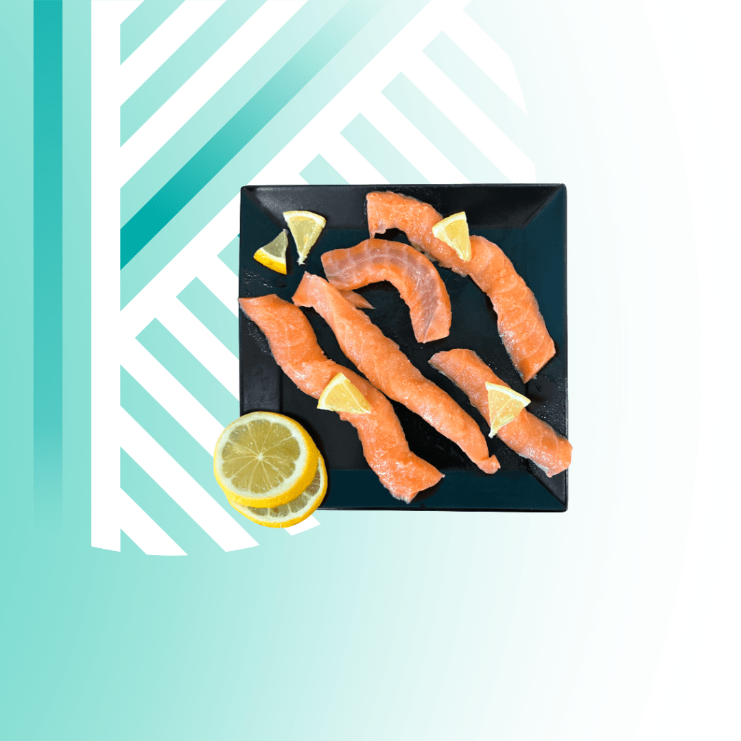 Обрізи лосося – невеликі шматки, без шкури. Свіжоморожені – суха шокова заморозка. Глазур: 0%. Без консервантів і ГМО.