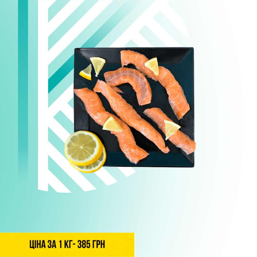 Обрізи лосося – невеликі шматки, без шкури. Свіжоморожені – суха шокова заморозка. Глазур: 0%. Без консервантів і ГМО.