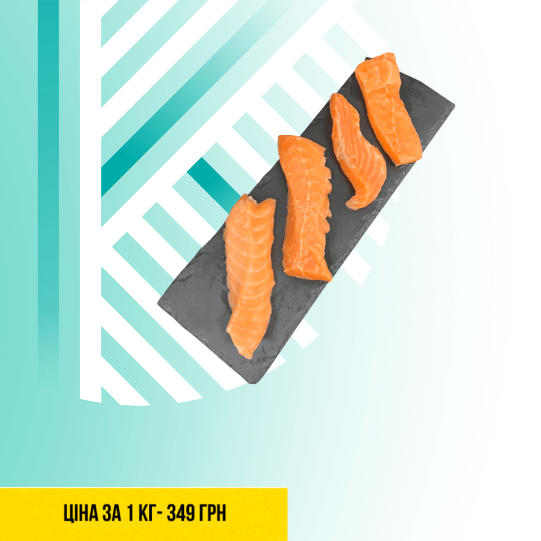 Смужки лосося – невеликі шматки, без шкіри. Свіжоморожені. Глазур: до 5%. Без консервантів і ГМО.