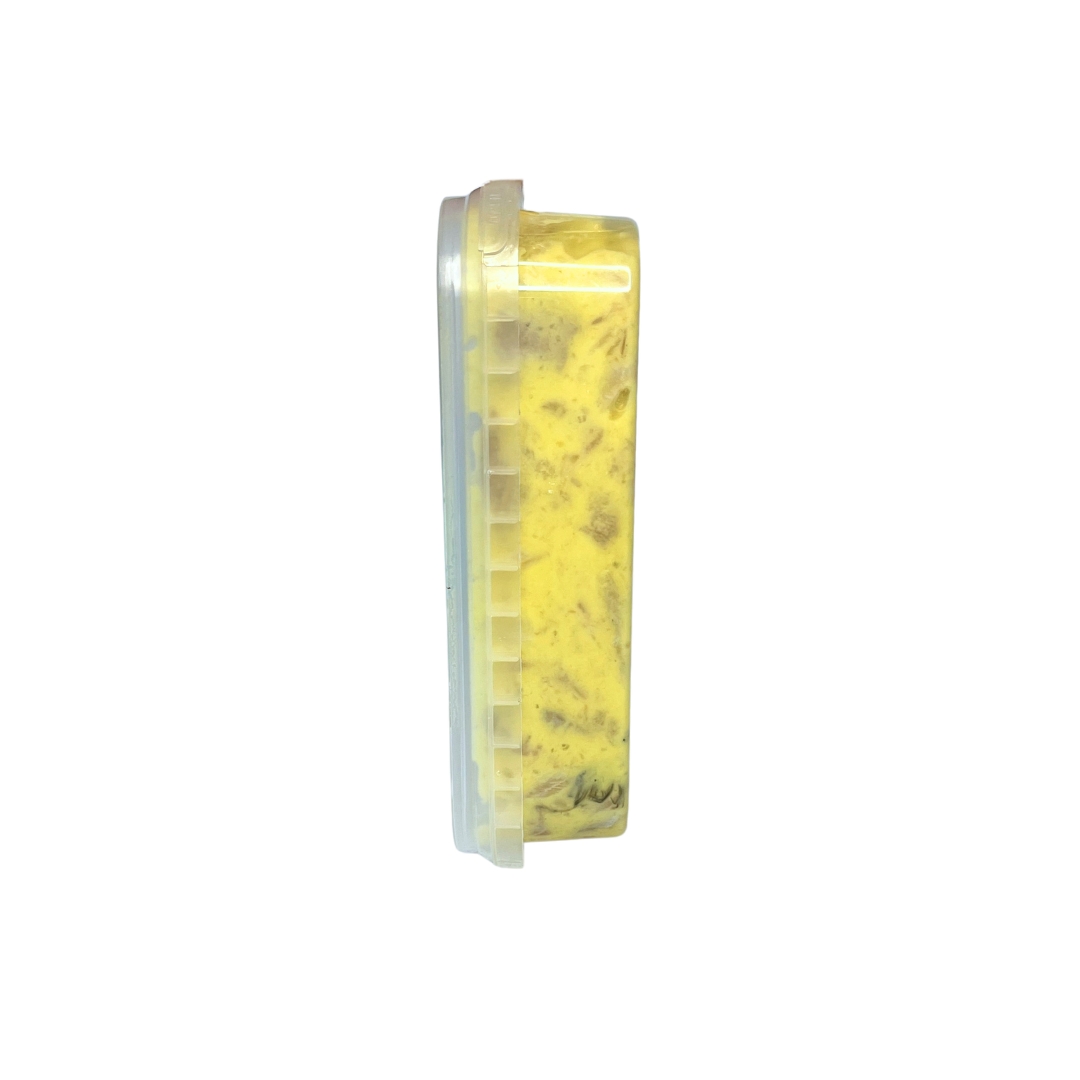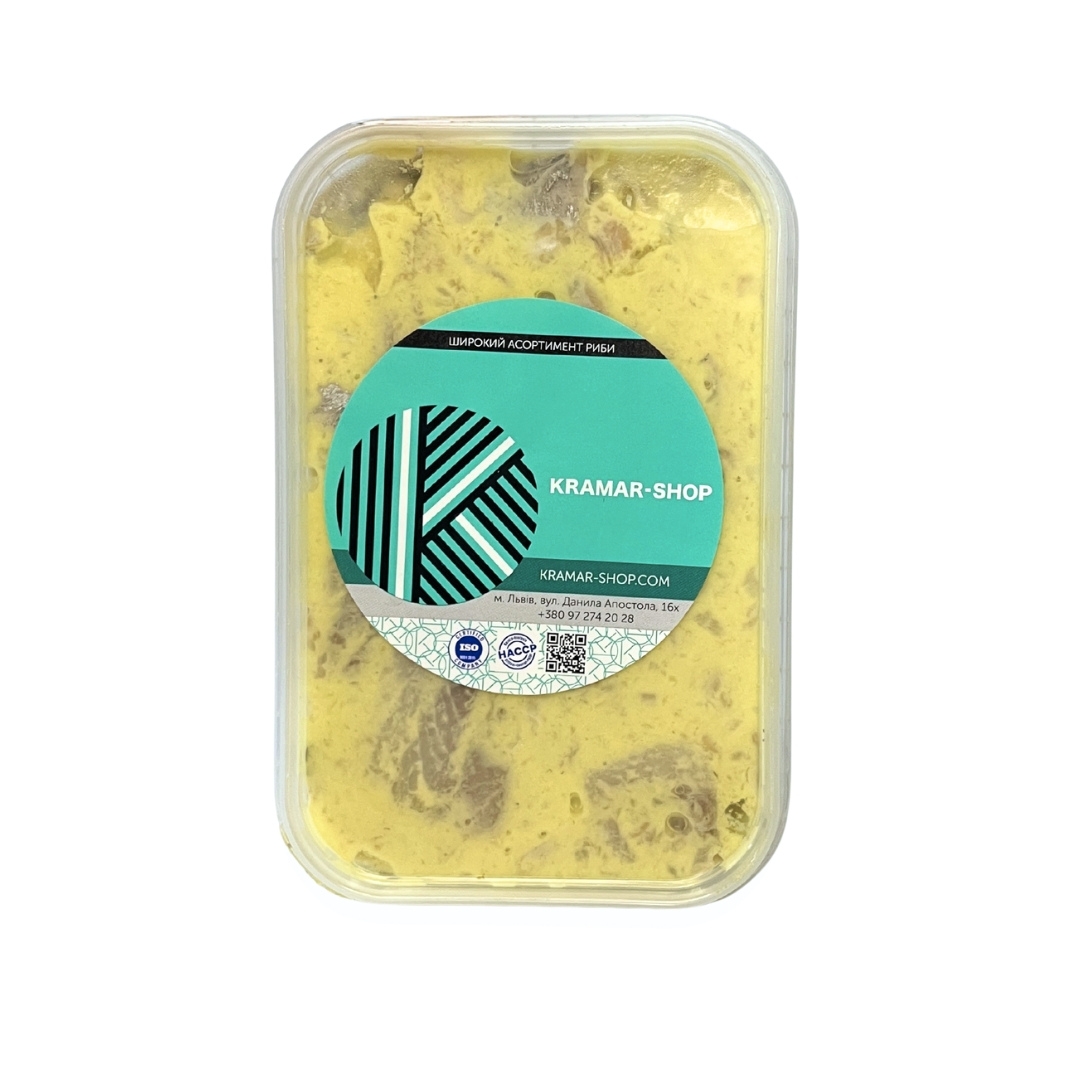 Склад: філе оселедця, майонезно-гірчичний соус (вода питна, олія соняшникова рафінована, крохмаль модифікований картопляний, сіль кухонна, кислоти оцтова, лимонна і молочна, бета-каротин; зерно гірчиці, цукор, куркума, коріандр, екстракт перцю духмяного); сіль кухонна, оцтова кислота.