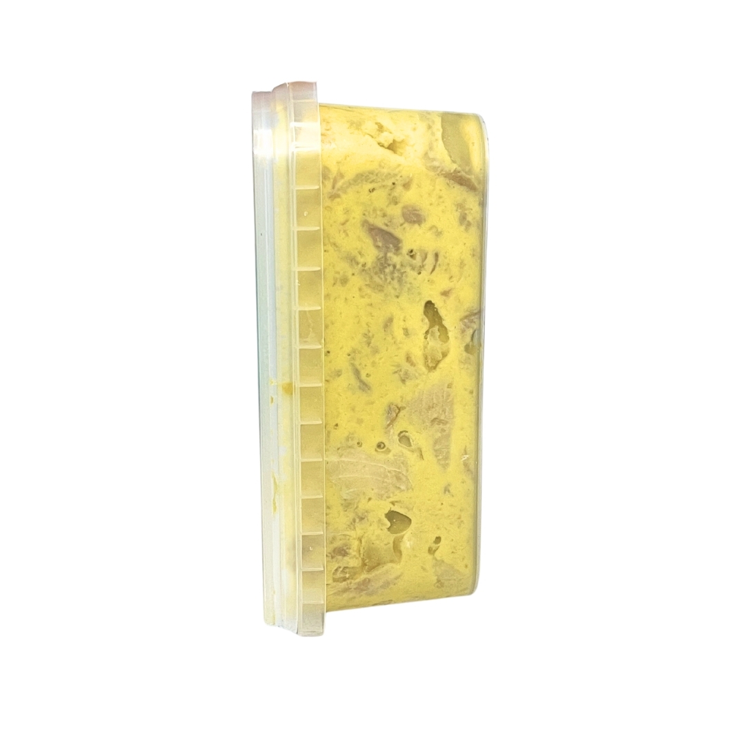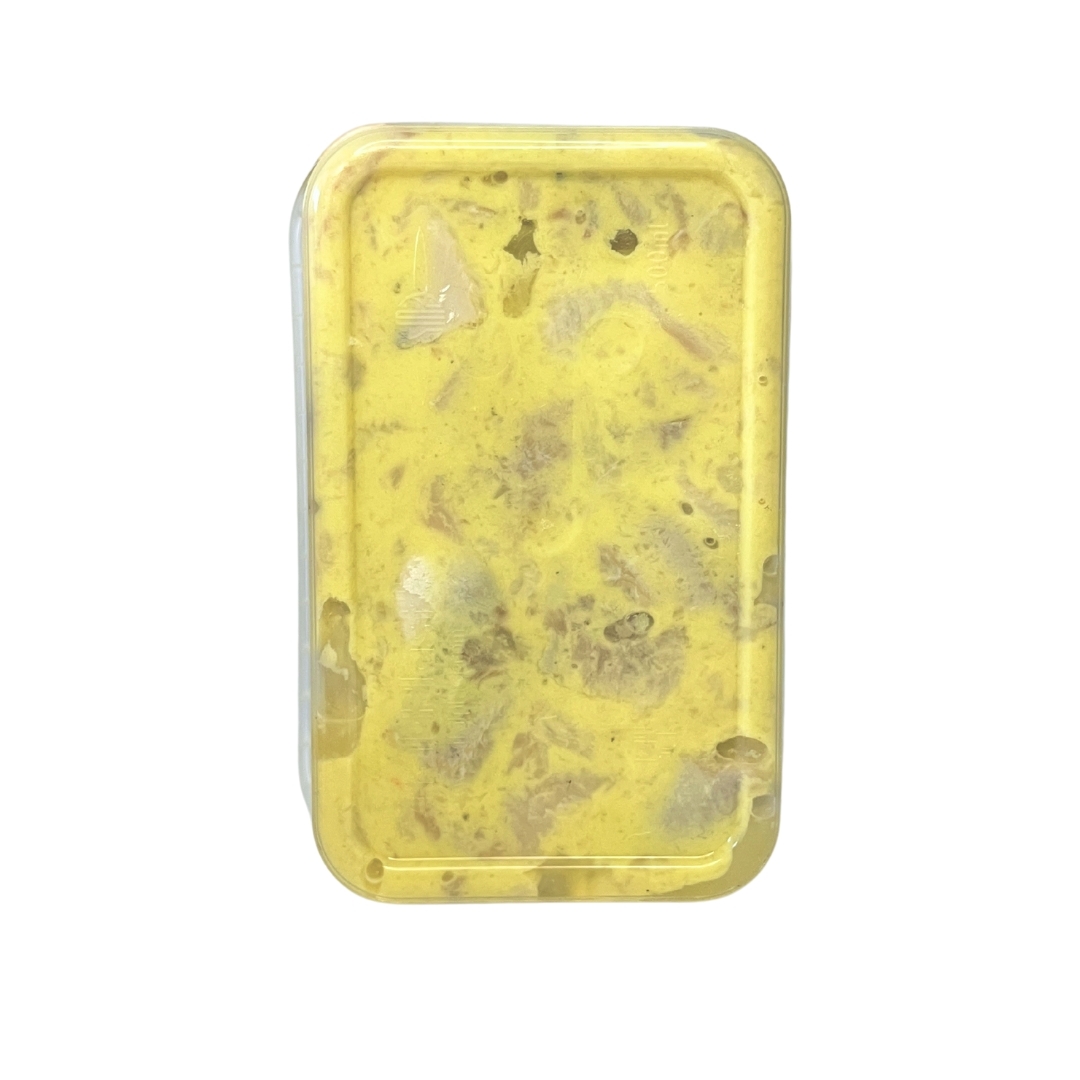 Склад: філе оселедця, майонезно-гірчичний соус (вода питна, олія соняшникова рафінована, крохмаль модифікований картопляний, сіль кухонна, кислоти оцтова, лимонна і молочна, бета-каротин; зерно гірчиці, цукор, куркума, коріандр, екстракт перцю духмяного); сіль кухонна, оцтова кислота.