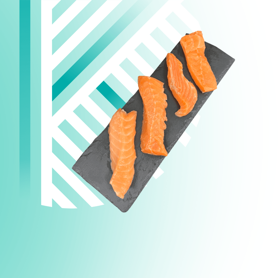 Смужки лосося – невеликі шматки, без шкіри. Свіжоморожені. Глазур: до 5%. Без консервантів і ГМО.