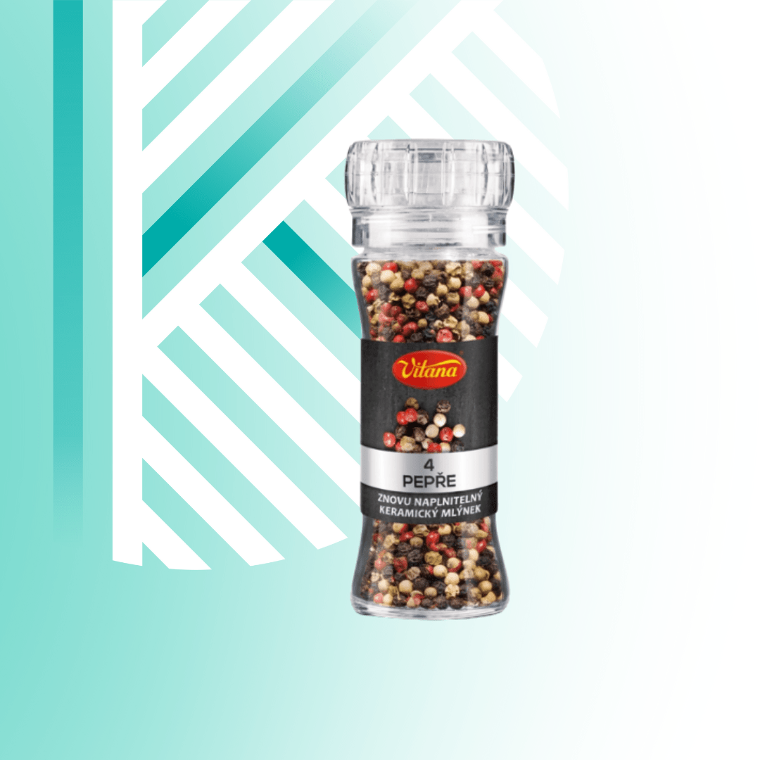 Склад: перець білий цільний, перець чорний цільний, перець червоний цільний, перець зелений цільний.